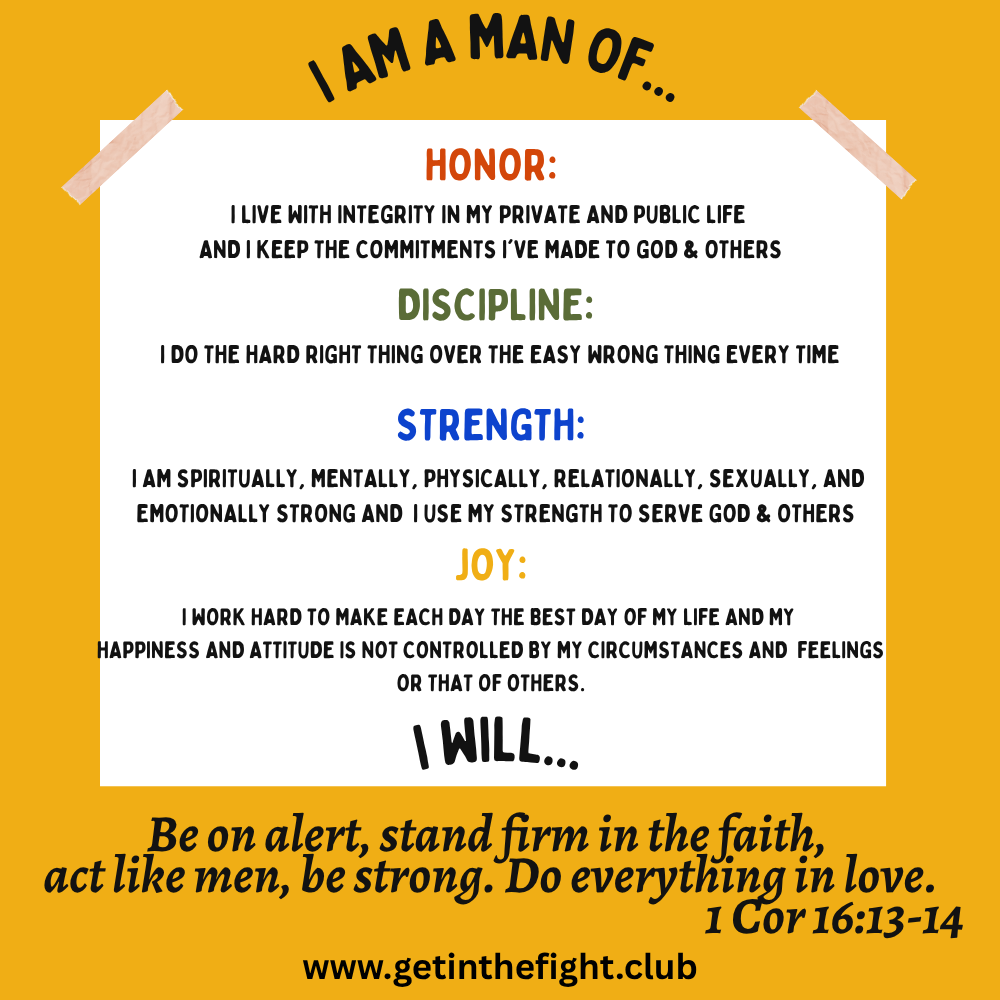 Email me and request a copy of the Fight Club Prayer (that yellow document above), and I'll send it to you. Print a few off, put one in your Bible, and another somewhere else where you'll see it every day, and then rehearse it at least once a day.