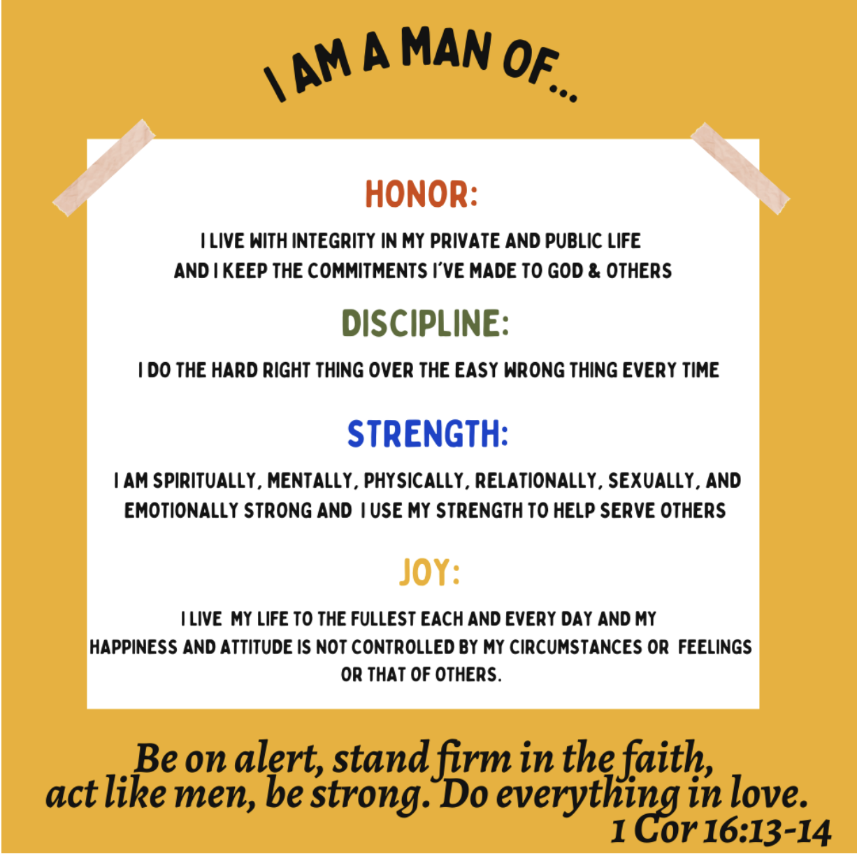 Help me to be a man of STRENGTH. Help me to be mentally, emotionally, spiritually, sexually, and relationally strong and help me to use the strength you give me to honor You and to serve others well.